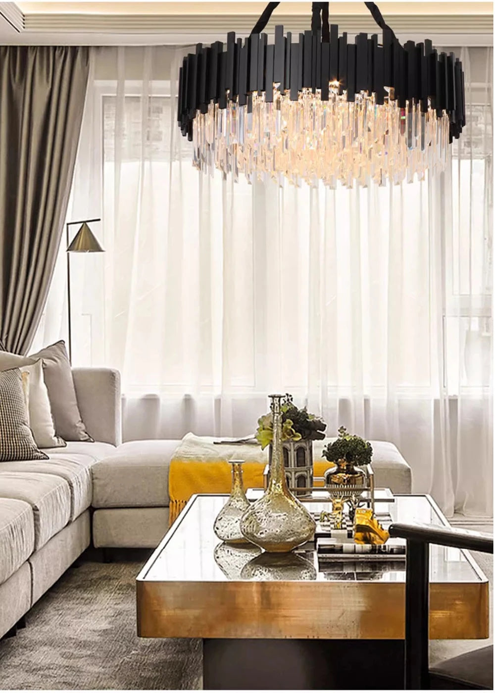 Ten żyrandol ma kształt bębna z dwoma warstwami. Górna część składa się z ciągłego pasa pionowych, nieprzezroczystych prostokątnych elementów, ułożonych blisko siebie i tworzących okrągłą ramę. Poniżej znajduje się dolna część, złożona z wielu pionowych, przezroczystych elementów pryzmatycznych zwisających w dół.