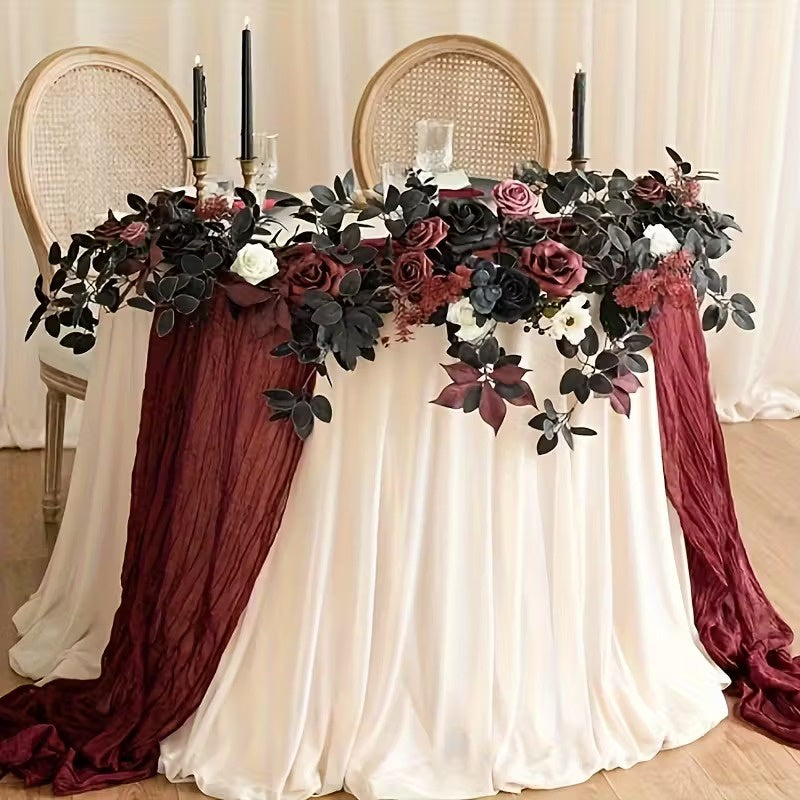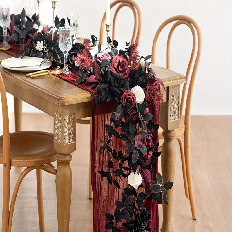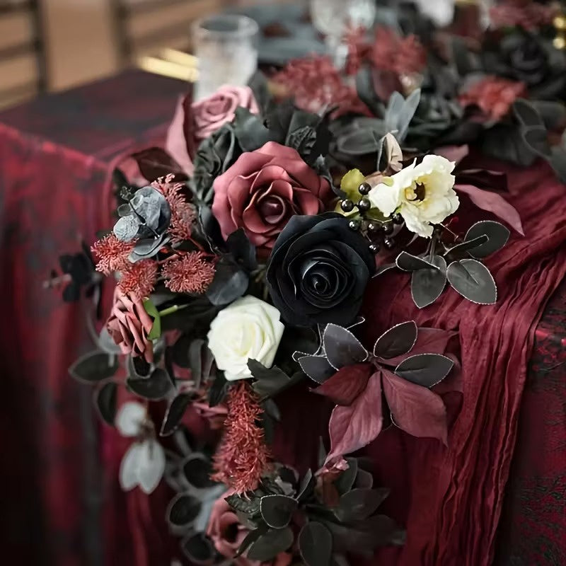 Ten kwiatowy układ to dekoracyjna girlanda złożona z różnych sztucznych kwiatów i liści. Zawiera kilka rodzajów kwiatów rozmieszczonych wzdłuż girlandy. Liście opadają wzdłuż całej długości girlandy. Cała girlanda jest długa, odpowiednia do ułożenia na stole.