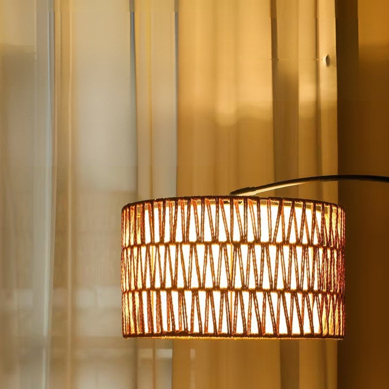 Abażur: Cylindryczny abażur wykonany jest z plecionego materiału, który pozwala światłu przechodzić przez wzór.