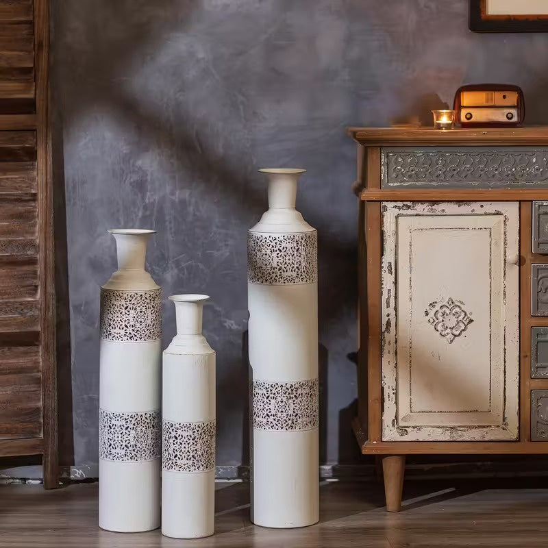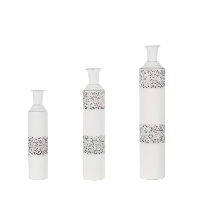 Ten zestaw obejmuje kilka wysokich dekoracyjnych wazonów o różnych wysokościach. Każdy wazon ma cylindryczny korpus, który stoi pionowo, prowadzący do krótkiej, podniesionej szyjki. Szyjka otwiera się w szeroki, rozszerzany otwór, odpowiedni do umieszczania roślin dekoracyjnych. Wazony można ustawić bezpośrednio na podłodze lub na niskich meblach jako elementy dekoracyjne.